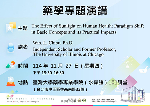 【藥學專題演講】The Effect of Sunlight on Human Health: Paradigm Shift in Basic Concepts and its Practical Impacts|Dr. Win. L. Chiou/ Independent Scholar and Former Professor, The University of Illinois at Chicago