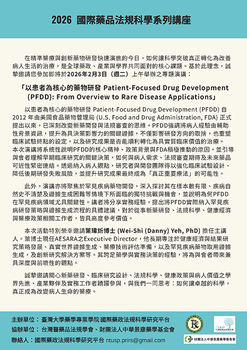 主題:以患者為核心的藥物研發 (PFDD)Patient-Focused Drug Development: From Overview to Rare Disease Applications