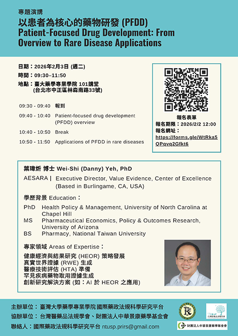 【演講轉知】2/3(二) Patient-Focused Drug Development: From Overview to Rare Disease Applications|葉瑋炘博士(Wei-Shi (Danny) Yeh, PhD)