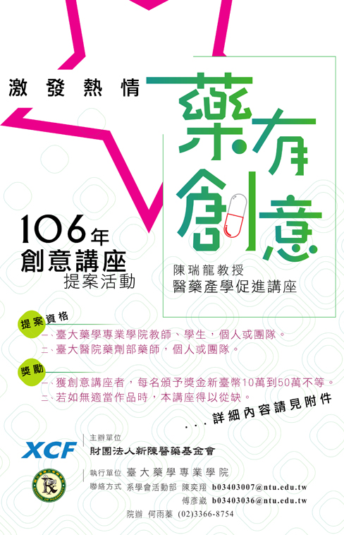 在這裡為各位帶來一個有機會獲得10~50萬獎金的機會 10~50萬 10~50萬 因為獎金真的很多所以我要一直講這樣大家才會想參加,活動名稱是陳瑞龍教授醫藥產學促進講座2017年創意講座提案活動,大家只需要發揮創意,為生活中遇到的醫藥相關問題提出一個解決辦法,就有機會獲得獎金以及將想法付諸實行的機會。 而且並不需要詳細說明使用的實驗方法、材料、儀器等等,例如:「將油性軟膏換成水性軟膏」這樣的提案就可以了,當然以上的提案是不會獲獎的因為太沒創意了。 目前參加資格僅限於 1. 臺大藥學專業學院教師、學生、或團隊 2. 臺大醫院藥劑部藥師、個人、或團隊 想參加的各位同學可以參考我們為各位製作的懶人包第1.5部,如果有任何問題也歡迎提出,我們會盡力幫忙解答。 活動預告!開學前來將暑假的創意想法具體落實吧 ! 創意思考工作坊9/8(五) 13:30-16:30,水森館101室 預計 8/24 上午8點開始報名 報名網址:https://goo.gl/forms/1mINmKKu2VVXUbQ32 限藥學專業院 40 名!!! |