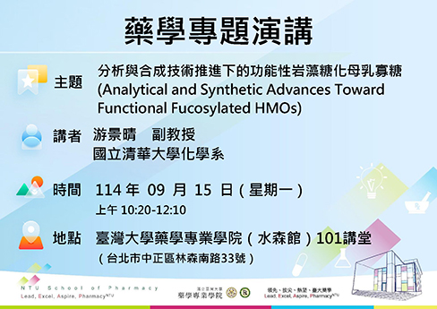 【藥學專題演講】Analytical and Synthetic Advances Toward Functional Fucosylated HMOs|游景晴 副教授/ 國立清華大學化學系