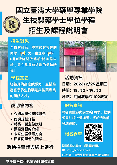 115學年度起招生,培育具備高度競爭力,且橫跨產官學界生物製劑與製藥專業的領航人才。 本學位學程採校內招生,開放臺大大二(含)以上學生申請轉入修讀,並授予理學學士學位(Bachelor of Science)。 大一生注意! 6月8號將開放轉系/雙主修申請,現在是提前規劃的最佳時機! 課程亮點包含: 現代製藥技術 生物製劑研發 法規與智慧財產 臨床研究與產業實務 -------------------------------------------------------------- 第三場招生說明會開跑! 生技製藥學士學位學程第三場說明會資訊如下: 115年2月25日(星期三) 晚上 6:30 共同教學館102教室 還沒參加過的同學,這次千萬別錯過! 現場將完整介紹學程特色、課程規劃與未來發展方向, 讓你一次掌握生技製藥領域的學習藍圖 快揪同學一起來參與,為你的未來多一個選擇! |
